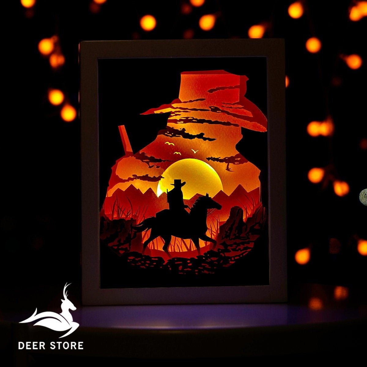 This design captures the cowboy spirit — the silhouette of a rider, the desert horizon, cactus landscapes, and Western motifs that instantly transport you to the prairies. When placed inside a light box and illuminated, the layers cast dramatic shadows, creating a 3D-like effect that feels alive.