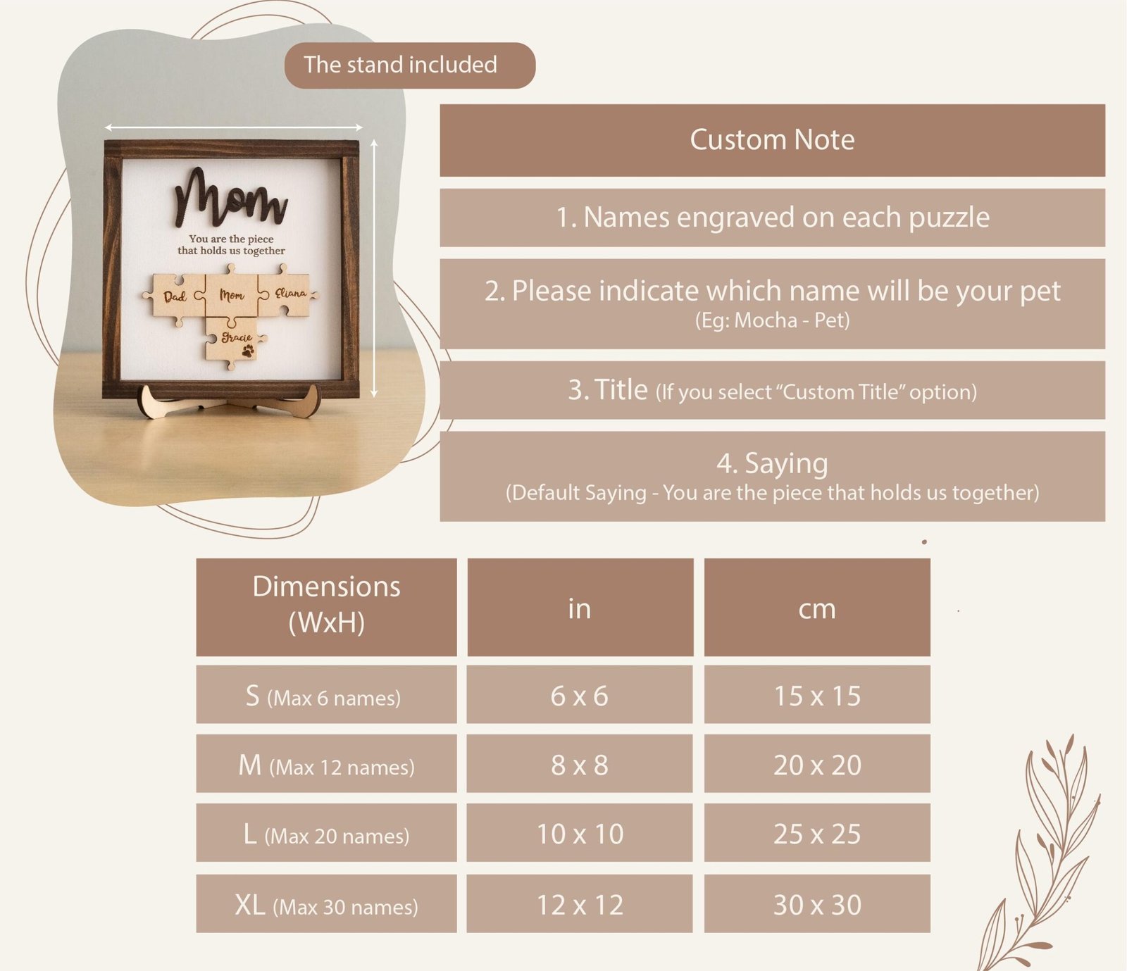 “Mom, you are the piece that holds us together” – This sentiment is showcased on this beautiful custom-made sign. Whether you are gifting for a birthday, Mother’s Day, Christmas, or just because—this handcrafted sign/shelf sitter is sure to be well received by the matriarch in your life. With an intricate black frame, welded onto an elegant scripted “Mom”—the details set this piece apart. Beneath the “Mom” is the phrase “You are the piece that holds us together” engraved onto our faux shiplap backing. Toward the bottom of the sign, the custom engraved puzzle pieces make this gift all the more meaningful. We can include up to 16 puzzle pieces onto the sign. The sign comes with a stand for displaying.
